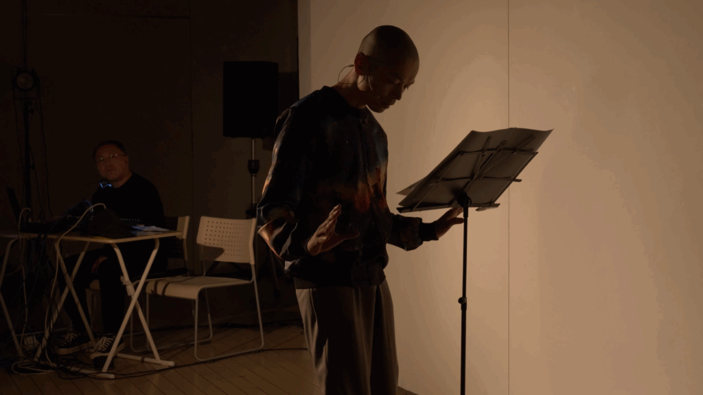 捩子ぴじんは現代社会の構造や、社会と身体との関係性を驚きとユーモアに満ちたダンスにして提示する。『ストリーム』は、コロナ禍における時間感覚の変容をテーマとする三部作、neji&co.コロナリポート『Sign』『Cue』『Out』のスピンオフとして2023年に初演された。捩子の力の抜けたモノローグとダンスが、突如変貌した2020年以降の世界と生活をパラレルに綴っていく。感染症が拡大して無人化した街、生活のためのごみ収集の仕事、そして子の誕生…。シンプルな言葉と緩やかなムーヴメントは、日常と非日常、現実と非現実のあわいを波のようにたゆたいつつ詩的な次元へ向かい、普遍的な境地へ至る。